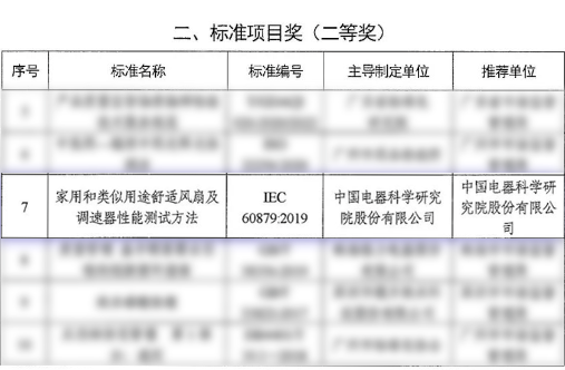 美的集团生活电器主要参与,由中国电器科学研究院牵头申报的IEC 60879:2019《家用和类似用途舒适风扇及调速器性能测试方法》获标准项目奖二等奖。