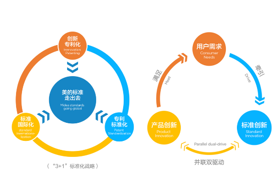 为有力支撑美的集团“科技领先”战略目标,近年来美的集团更进一步推动实施“创新专利化、专利标准化、标准国际化、美的标准走出去”的“3+1”标准化战略,通过“集团-事业部”两级标准化管理体系和“标准创新+产品创新”并联双驱动模式,把创新成果转化为先进技术标准。