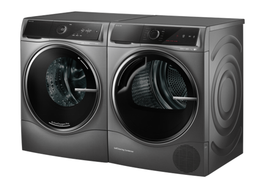 干衣机方面,全新博世第8代热泵干衣机搭载自适应烘干技术,拥有320m³/h的超大烘干风量,配合全新热交换系统,极大提升烘干效率和速度,实现日常全家衣物90分钟之内烘干,是博世家电品牌目前速度最快的热泵干衣机;65°C除菌烘功能,实现99.99%出色除菌效果同时呵护织物,更通过前沿科技降低噪音实现静音烘干;专利冷凝器自清洁技术的加持,让机器始终长期保持高速烘干并定期自动清洁;另外,创新的虚拟触控环和TFT超薄真彩显示屏,让新品套装人性化的交互体验又显智能化。