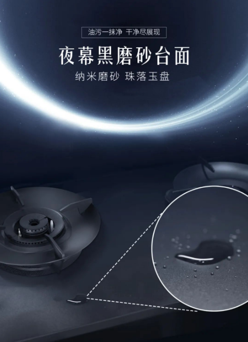 针对清洁难题,夜幕黑纳米磨砂台面,采用先进的纳米技术,油污一抹即净,减轻家务负担,让每位用户都能轻松享受烹饪后的乐趣。