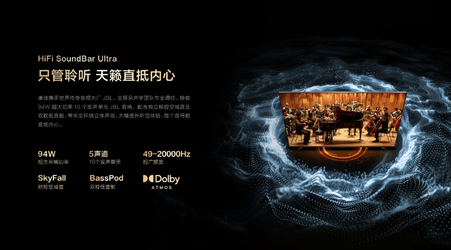 在音质表现方面,康佳与全球知名的音频巨擘JBL携手合作,依托金耳朵声学团队的精湛调校技术,A8 Pro配备了94瓦超大功率、拥有5声道10发声单元的JBL音响系统。同时,结合独特的鲸腔空域音技术以及双腔低音舱设计,为用户带来全环绕立体声场的震撼听觉体验,显著提升整体的音质感受,让每一个音符都能深入心灵,触动人心。