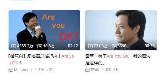 但不得不说的是,雷军确实在音乐方面有不俗的成绩——根据百度百科“Are you OK”中的信息显示,雷军在印度小米4i发布会演讲中的一句Are you OK,被B站的鬼畜区UP主Mr.Lemon重新剪辑成一首MAD神曲,在2015年4月底一经发布就迅速走红,其魔性的旋律引得其他网友在网络上疯传。