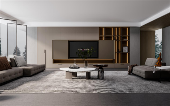 电视背景墙大面积深色饰面与金属、玻璃的结合令人眼前一亮,内敛沉稳中带着神秘和灵动,构建起了空间内全新的平衡感。右侧设计了一个具有强烈视觉冲击的玻璃展示柜,采用了特色层板工艺+厚板与薄钢板组合开放格,发光的亚克力背板悄声无息地营造着浪漫轻奢的氛围,不同材质的碰撞丰富着设计层次,从木质到玻璃到金属,起承转合间是设计师对空间深层解读后的用心诠释。