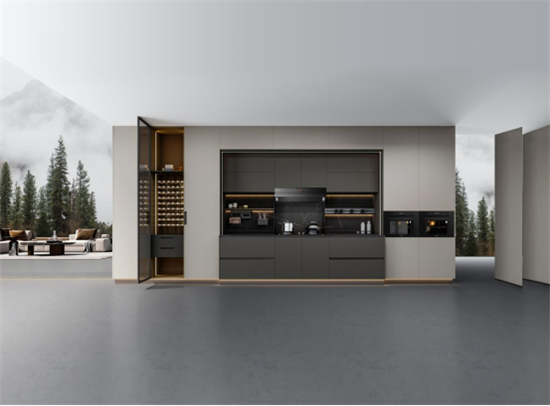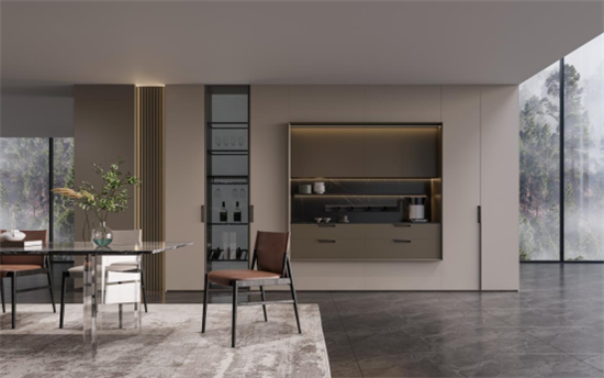 设计师围绕空间功能、布局,运用自然的石材、木饰面以及时尚的玻璃和金属材料,以用心的细节、人体工程学的设计打造了一个人性化的厨房。不同材质的碰撞,打破了空间的克制与拘谨,愉悦感从这个自由流动的空间开始。有序的家居氛围,离不开精细化的收纳体系,厨房整体采用落地高柜设计,充分增加了收纳空间,也让整体更显简约和大气。烹饪区融入了智能化系统,操作时更加便捷。酒柜的设计,彰显了品味与格调,增添了空间的时尚气息。