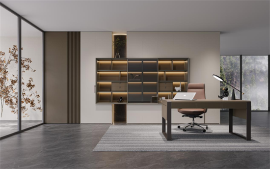 设计师以木饰面、金属、玻璃等材质,将书柜布局为封闭式、开放式、半开放式,丰富了空间的层次感,让空间安然舒适,清明简静,彰显出书房的恢弘大气,让整个空间更加从容优雅。