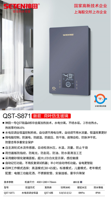作为安全热水专家,神田S871也配备了水电分离、防漏电、防干烧、防超温、防超压、故障自检、防雷击、防脉冲干扰等多种安全保护。自动记忆功能,不用反复调试机器。半小时自动待机,省电更智能。