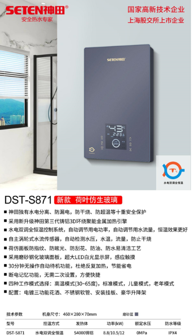 S871采用了全新平台的水电双调全恒温技术,自动调节用电功率,自动调节用水流量。变频恒温技术只能调节用电功率,不能调节用水流量,所以变频恒温技术类似于汽车的手动档,水电双调全恒温技术类似于汽车的自动档,是更高档更人性化的恒温技术。