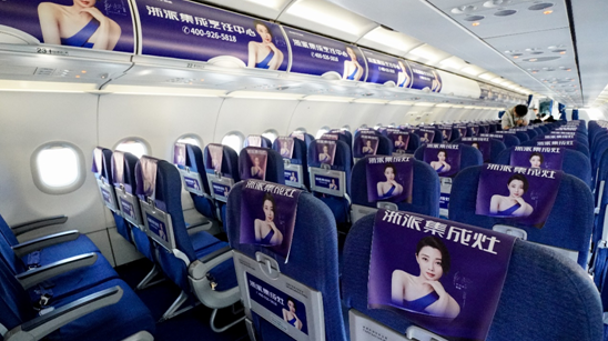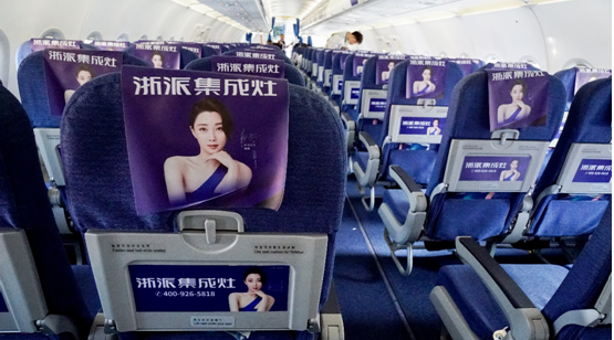 4月,浙派集成灶冠名的第一架飞机在重庆首飞。鲜艳醒目的“浙派集成灶”五个大字在飞机外侧熠熠生辉,在机场候机厅就能感受浙派的“品牌力量”。进入机舱,浙派元素更是无处不在。行李架、头枕巾、小桌板等各种位置,都融入了浙派的身影。相对于高铁和央视等传统或是常见的投放平台而言,机舱环境更具有封闭性,使得品牌得以被聚焦和放大,传播的“岛式效应”则被凸显。高密度、高频率的广告宣传,给予乘客强烈的视觉冲击。在这里,浙派集成灶的品牌形象和产品信息如同海浪般汹涌澎湃,强而有力地冲击着每一位乘客。