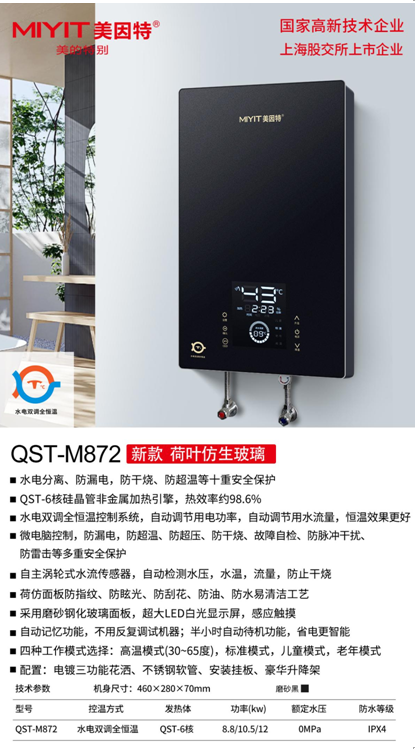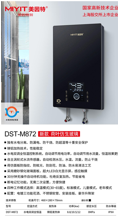 2024年5月,热水器行业的时尚品牌美因特对外界宣布:全新水电双调全恒温平台的新品M872正式上市,M872分为QST硅晶系列与DST铸铝系列,DST-M872的上市,意味着美因特铸铝发热体即热式产品也开始应用水电双调全恒温技术。
