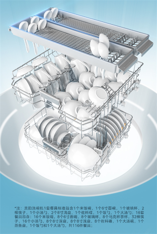 除了标准的16套餐具容量外,它还添加了灵动可调托盘设计,以适应各类中式厨具的多样化需求。无论是日常使用的饭碗、碟子,还是更大的炒锅、汤锅,甚至是电饭煲内胆,都能在这款洗碗机的碗架上找到合适的位置。