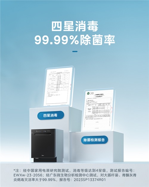 有些家庭在利用洗碗机后,将其作为长期的碗柜使用。长此以往,未被完全烘干的水汽在洗碗机内部滞留,逐渐酝酿出难闻的气味并滋生有害病菌。这些病菌与异味对原本已洗净的碗碟构成了二次“污染”,引发了消费者对洗碗机发霉、发臭等问题的投诉和负面评价。为了打破这一尴尬局面,美的晶焰洗碗机S65Pro不仅专注于洗涤与烘干,更增加了消毒功能,为用户提供了真正的一站式洗烘消存体验。