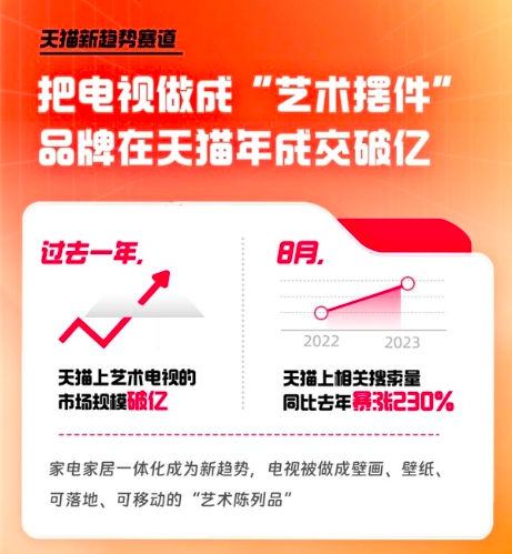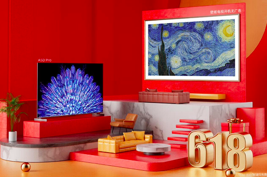 有人追求好音质好画质,还有人追求极致家居美学。强调观赏性、装饰性的艺术电视自然成为家庭新宠。2023年末,京东发布的一份《消费者更喜爱的平板电视年度热卖榜》显示,京东艺术电视自年初以来的销售超预期,成交额同比提升超过8倍。去年618期间,天猫也有数据显示,艺术类电视相关搜索量同比上年增长230%。