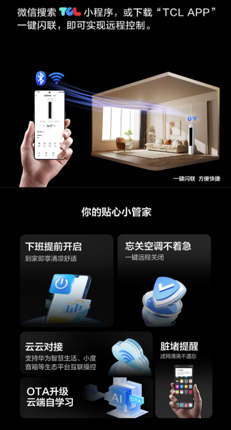 智能化不仅是一种技术的革新,更是一种生活方式的变革。TCL真省电Pro柜机支持手机远程智控功能,可提前开启空调,一回到家就享受清爽舒适的家居环境;还可以选择微信搜索小程序进行一键闪联,操作简便快捷。