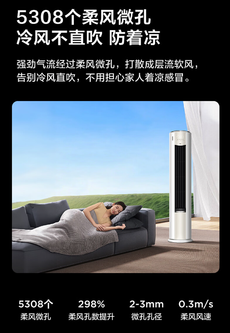 在柔风模式的设计上,TCL真省电Pro柜机采用5308个智慧柔风微孔,确保强劲冷风在经过时能够被有效打散。经过微孔过滤和分散,原本刚劲的气流被转化为层流软风,柔和而舒适,宛如自然微风般拂过肌肤,避免冷风直吹带来不适感。