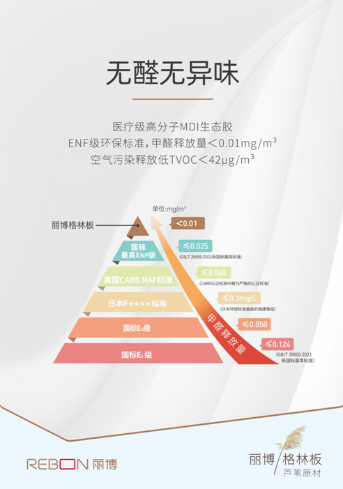 一直以来,人们深受甲醛的危害却束手无策……丽博格林板采用医疗级MDI生态胶,从源头做到无醛添加,甲醛释放量<0.01mg/m³趋近于0.达到国标最高ENF级环保标准,空气污染物释放低,总挥发性有机化合物TVOC<42μg/m³,刺激性气味几乎闻不到,只留天然粽香。