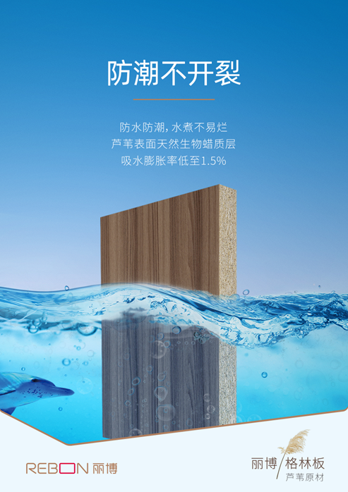 芦苇是水生植物,表面有着天然生物蜡质层,自带防水性,配以MDI胶,使得板材具有卓越的防潮性能,吸水膨胀率低至1.5%,远远低于行业标准(8.0%)。