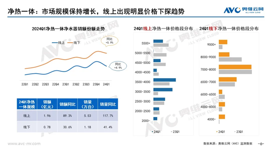 此外,奥维云网(AVC)发布的2024年一季度净水器市场总结报告显示,从价格分布来看,线上1000-1500元价格段份额增长,很多企业在中低端市场加大产品内卷;中端1500-3000元市场份额有所下滑。线下价格呈现两极化趋势明显,2024年一季度线下品牌数量迅速走高,品牌竞争加大,中低端市场份额增长。