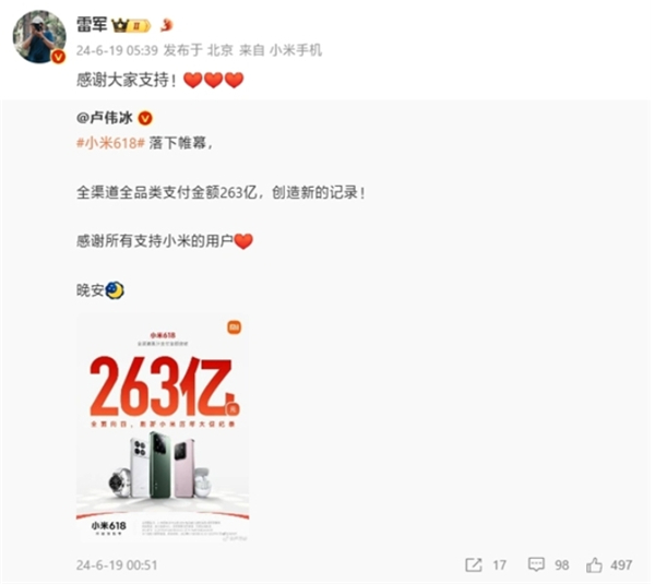 小米618全渠道累计支付金额突破263亿元,刷新了小米历年大促记录。