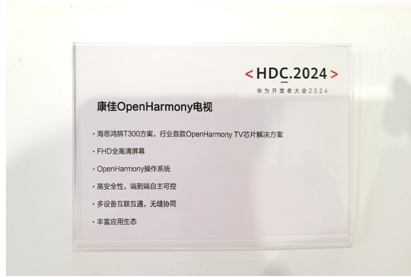HDC2024活动现场,康佳与海思联合展示的OpenHarmony Standard最高层级的鸿鹄媒体创新方案,引领了全新的电视影音娱乐交互体验,更彰显了康佳电视对市场趋势的精准把控和高瞻远瞩的战略眼光。