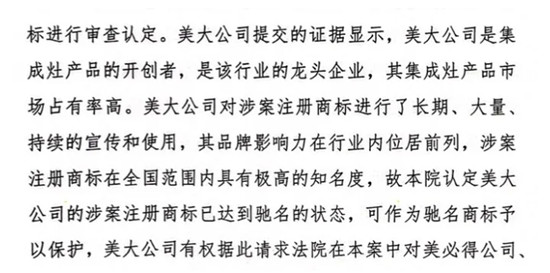 法院在判决书中载明,美大公司是集成灶行业开创者和龙头企业,市场占有率高,在全国范围内具有极高知名度,美大公司的行业地位、品牌价值和品牌影响力已经通过司法判决得到了充分的、权威的肯定。