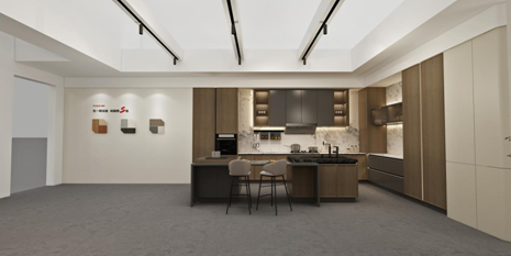 「君悦」以深咖色和浅咖色丽肤门板为主,以特色长短拉手、特色厚薄 ABA 层板、45°斜切等创新元素为亮点,通过材质、肌理、色彩的变化,工艺交映融合,唤起空间的情绪,承载居住者在不同文化熏陶下的审美、思想和情感寄托,彰显他们的身份与格局。