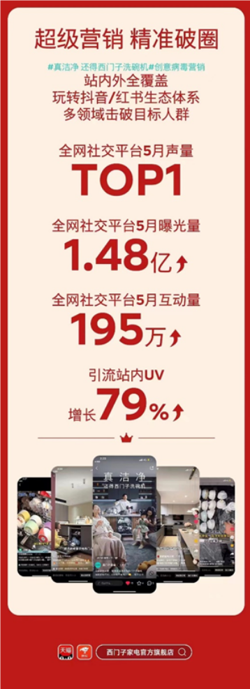 在线上,西门子洗碗机成功发布了618营销活动,发起#真洁净,还得是西门子家电#的社交媒体话题讨论,通过大数据分析精准定位目标消费群体,深刻挖掘消费者日常生活中的真实洗碗痛点,通过在小红书和抖音平台创造了一系列富有创意且贴合中国消费者日常生活的视频与图文内容。这些内容在社交媒体上广泛传播,不仅提升了品牌曝光度,还实现了与消费者的深度互动。在活动期间引流站内UV增长79%,全网社交媒体平台5月曝光量1.48亿,以互动量195万达到5月社交媒体平台声量第一,成功将品牌信息有效触达至更广泛的潜在用户群体,进一步加深了消费者对西门子洗碗机洁净技术的认知。