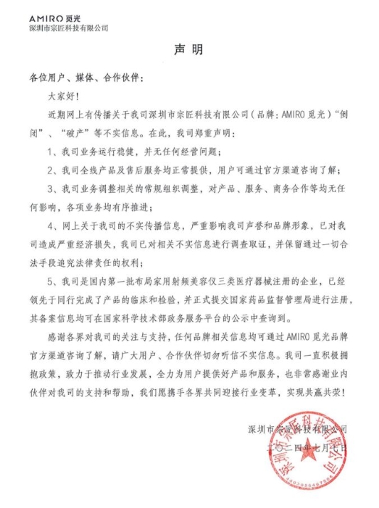 就在外界纷纷猜测AMIRO觅光是否即倒下之际,公司方面给出了回应。相关负责人紧急辟谣,坚称“觅光倒闭”为不实信息,声称公司正在进行正常的业务调整,目前运营状况良好,各项业务都在稳步推进中。他们承诺将继续为消费者提供高品质的产品和服务,力图挽回消费者的信心。