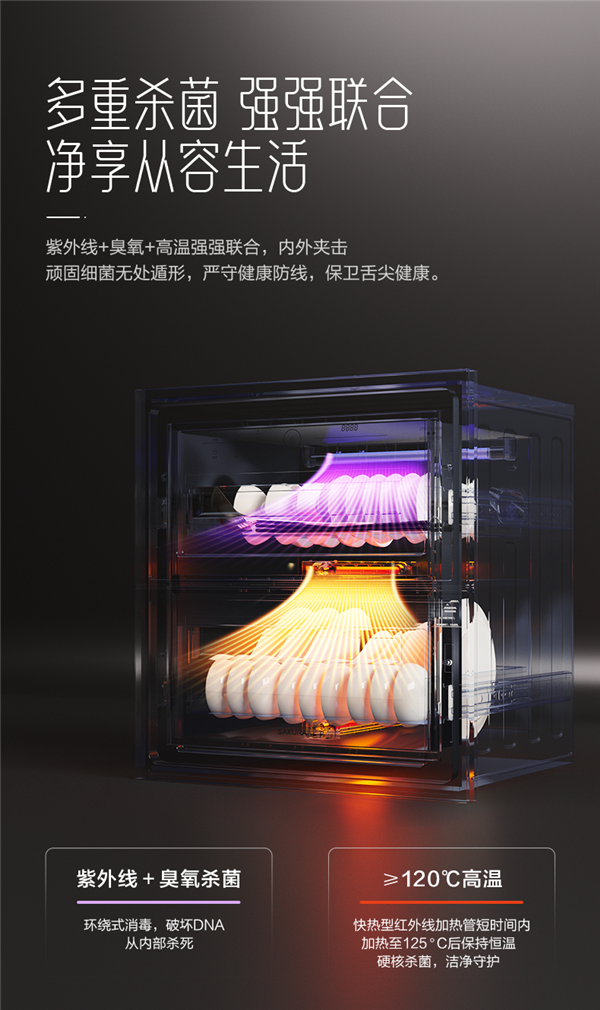 守护健康,二星级消毒更安心 梅雨季的连绵阴雨,让细菌有了可乘之机。但有了樱花窈窕系列消毒柜SCQ-110T530,每一餐都能享受无菌的安心。它采用紫外线、臭氧与高温三重杀菌技术,形成全方位无死角的杀菌网络,确保餐具上的每一寸空间都远离细菌侵扰。达到二星级消毒标准,即便是顽固细菌也无所遁形,让餐具回归最本真的洁净与安全。