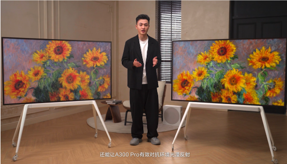为了让画作显示起来更加逼真,TCL A300系列屏幕采用了纳米微晶技术,能有效对抗环境光漫反射,呈现哑光显示效果。此外还有量子点Pro 2024技术,不仅能还原真画的纹理质感,还带来了行业超高色域,能显示的色彩更多,让屏幕上面的画作栩栩如生。