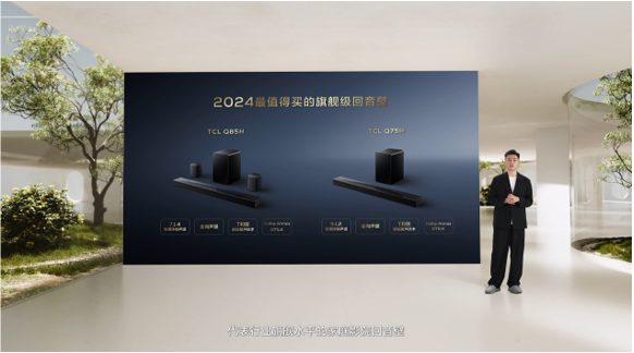 TCL在此次新品发布会上还带来了2024年最值得买的旗舰级回音壁——TCL Q85H(实际到手价3499元)、Q75H(实际到手价2699元)和S系列回音壁——TCL S55H(实际到手价999元)、S45H(实际到手价699元)。其中,TCL Q85H依靠7.1.4物理环绕声道、全向声弧、T和弦联动发声技术、声场自适应技术、Dolby Atmos和DTS:X认证等行业顶级声学设备技术、算法和调校加持,能大幅提升立体环绕音效果和临场感受,被誉为是影音享受必备Soundbar。