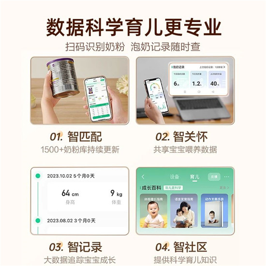 在当前“AI正在改写服务”的趋势下,苏泊尔也同样支持“智能育儿”。泡奶机使用AI智适应及IOT系统,提供科学智能的喂养方式。APP扫码即可识别1500+奶粉信息,同步本机泡奶黄金温度。APP自动记录、宝宝每日每餐喝奶时间、奶量,多家庭成员带娃喂养信息可共享。