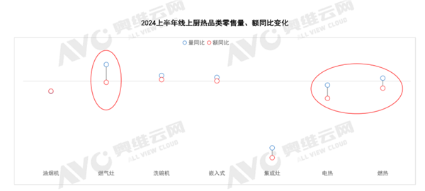 奥维云网(AVC)监测数据显示,2024年618线上厨卫品类中高端市场增长乏力,以高端灶具(2500+)、嵌入式(7000+)、燃热(4000+)为例,其零售额份额相较于去年618同比下滑了1.7%、1.9%、3.6%。线上燃气灶、嵌入式、集成灶、电热、燃热品类均价同比去年618分别下滑73元、87元、341元、138元、24元。