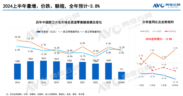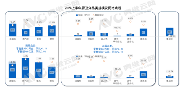 就潮流家电网的调查而言,从体感上来看,2024年上半年度集成灶下滑比较明显,分体式厨电小幅下滑,集成烹饪中心因为基数小,前景较为明朗。