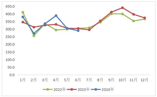 2022年-2024年6月洗衣机行业出口月度季节特征(万台)