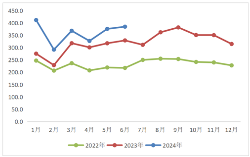 2022年-2024年6月洗衣机行业内销月度季节特征(万台)