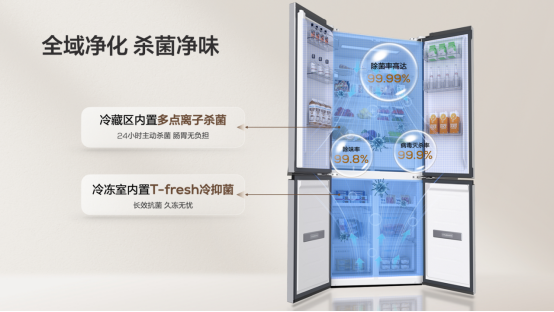 为了进一步解决“难闻怪味”,TCL基于两大领先的杀菌技术,彻底消灭冰箱内的有害致病菌:冷藏室采用多点离子杀菌技术,24小时主动式杀菌除味,除菌率高达99.99%,除味率达到99.8%,病毒杀灭率高达99.9%;冷冻室则采用T-fresh冷抑菌技术,主动吸附和分解异味,有效抑制细菌滋生。TCL T9 Pro确保净味、杀菌、消毒一步到位,在确保食材储存的安全性的同时,从根源上解决了因病菌代谢引发的怪味难题。