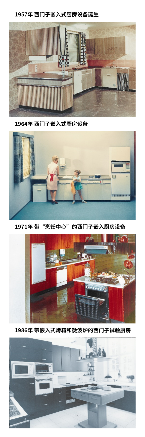 嵌入式家电的概念最早可以追溯到20世纪中叶。随着当时人们对现代化生活方式的追求日益增长,嵌入式家电应运而生。嵌入式家电不仅提升了厨房布局的效率,还通过节省空间使得厨房环境更加整洁、时尚。早在1957年,西门子家电就开始在嵌入式厨房领域进行探索与创新。这一举措彻底革新了传统厨房的配置和风格,开创了兼顾美观设计与实用功能的新纪元。