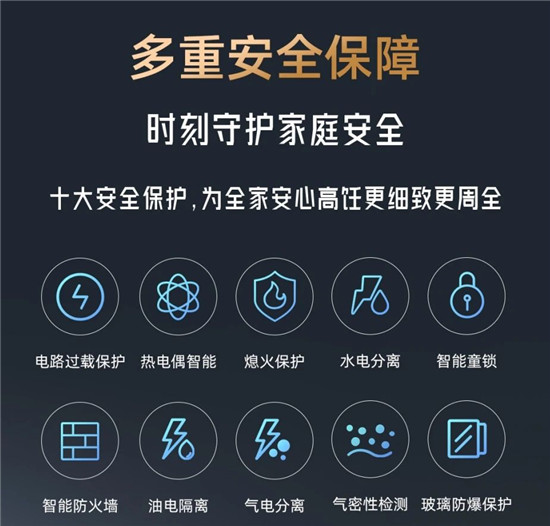 革新防护之力,筑起健康堡垒,智能防火墙系统、离子感应熄火保护系统、燃气泄漏保护系统三大智能安全防护系统,24h智能伺服、感应、提醒,同时特设童锁、漏电保护等安全保护,保障厨房安全新高度。