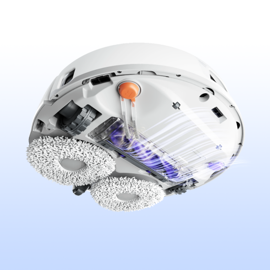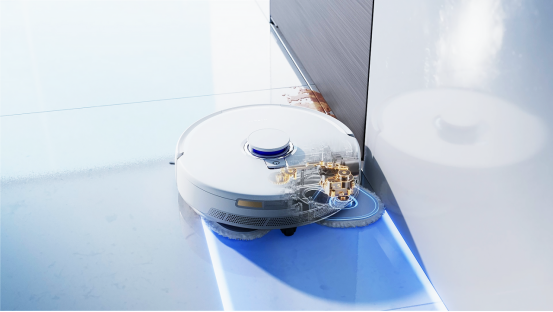 云鲸J5在保留前代产品核心拖地优势的基础上,创新开发了仿生人手擦地系统,有效解决边角清洁问题。不同于市面上其他厂商的机械臂外扩方案,云鲸自研的仿生人手擦地系统,保留了清洁覆盖更优的勒洛三角形拖布结构,在外扩的同时可保持8N恒压拖地压力,对于边角脏污清洁效果更佳;同时坚持双向旋转拖布的设计,拖布清洁能力更强,整体清洁效果更佳。此外,云鲸J5新增了动态贴边清洁功能,仿生人手擦地功能协同Smart-Swing智能贴边,边扭边伸,可灵活处理家庭环境中不同形状障碍物的延边清洁。