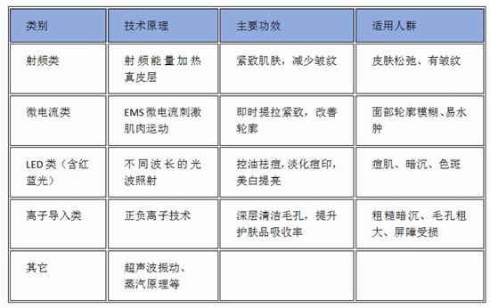 目前,市场上的美容仪产品主要分为五类,分别是:射频、微电流、LED、离子导入和其他。