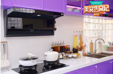在这个超级吸睛的梦幻紫厨房,共有四款华帝产品,分别是小飞翼K6烟机、燃气灶i10309L、营养师蒸烤一体机V5和双子星洗碗机D3000.从外观上看,这几款产品的颜值都非常高;性能上,华帝燃气灶i10309L尽显“灶王”本色,大火猛,小火稳,猛火快炒或慢火细炖都能轻松应对。营养师蒸烤一体机V5则能让各位“大厨”享受到多样化的烹饪模式带来的无限创意。