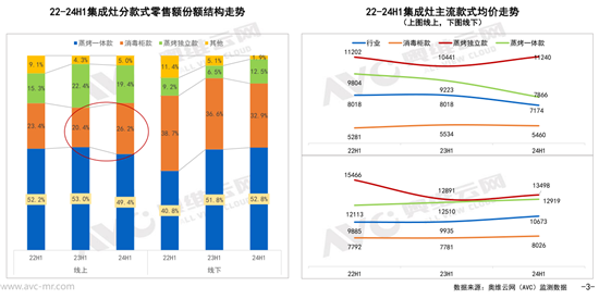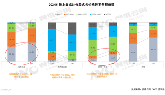 很明显的一个特征就是“基础款产品回暖”,据奥维云网(AVC)监测数据,2024年上半年消毒柜款线上市场份额同比增长5.8个百分点。而作为市场的升级款式,蒸烤一体和蒸烤独立款份额上略微降低。