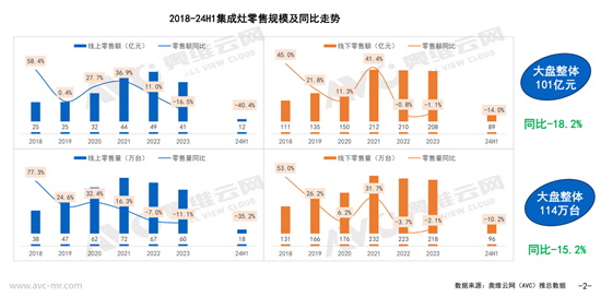 奥维云网(AVC)推总数据显示,2024年上半年我国集成灶市场累计零售额、零售量分别为101亿元、114万台,同比分别下滑18.2%、15.2%。
