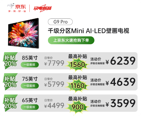 节能补贴活动期间,康佳电视特别推出了新品G9 Pro Mini AI-LED壁画电视作为本次活动的主打产品,引领绿色节能新风尚。这款电视搭载前沿的Mini AI-LED分区控光技术,1920个独立控光分区配合AI激光控光芯片,实现像素级精准控光,每一帧画面都层次分明,色彩鲜活。外观设计上,85/75/65英寸全面屏设计,一体纯平贴墙如同艺术壁画,不仅提升了观看体验,更完美融入现代家居环境,彰显品味与格调。