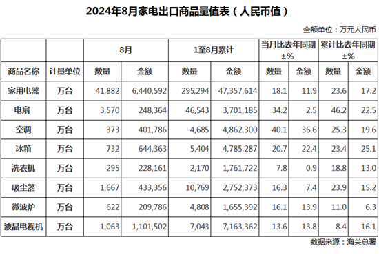 具体来看,8月出口空调373万台,同比增长40.1%;1-8月累计出口4,685万台,同比增长25.3%。