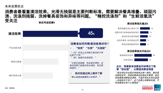 除了容量,消费者最看重清洁效果,清洁后的餐具“光滑无残留”是主要判断标准。洗得干净的前提下,“长效抑菌存储”和智能化功能备受关注,具有强大的发展潜力。