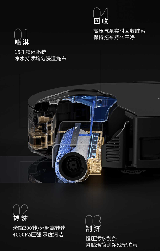 科沃斯X8 Pro Plus的方案则是先通过喷头将清水补充到滚筒拖布上进行拖地,之后带着脏污通过有着浮动结构的刮条将污水刮干净后,再次补充清水进行拖地,以确保接触地面的水始终是干净的水,从而避免以脏拖脏,实现真正意义上的恒压活水洗地。