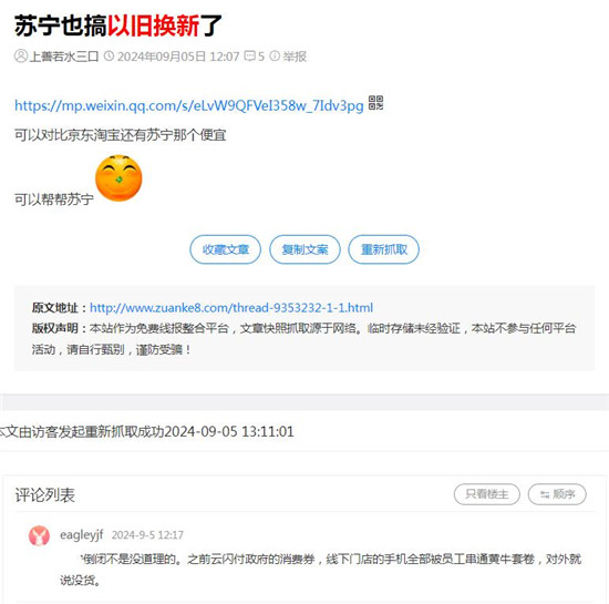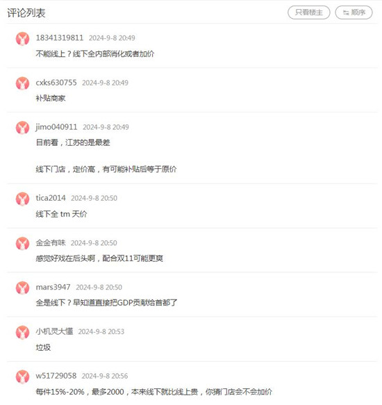 而现在,已经到了9月,以旧换新政策在各省、市基本已经进入落地阶段。在抖音、小红书等大众化的社交平台,基于实实在在的价格补贴,以旧换新新动作很快收到了普遍的好评。但是在一些专门的购物类社区,这些对价格极其敏感的受众们,对于各地以旧换新的举措其实并不是那么满意,特别是因为各地落地方式和内容的差异,甚至招致了不少怨言。