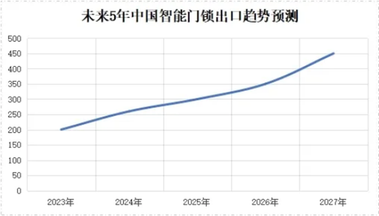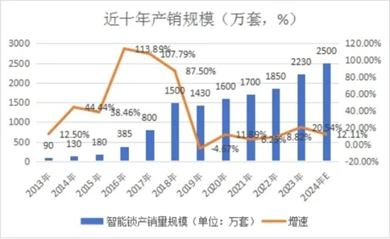 从中国日用五金技术开发中心发布的《2024年全国智能门锁行业市场调研半年报》来看,近十年来中国智能锁产销规模进入稳定增长阶段,全球高端智能锁市场规模也持续增长,市场空间巨大。根据日用五金数据,2023年,全国智能门锁产销量达约2230万套,同比增长12.7%;预计2024年智能门锁行业产销量将突破2500万套。