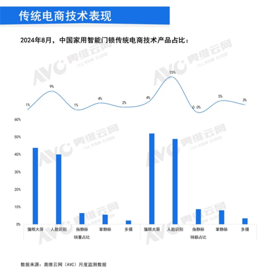 值得一提的是,静脉识别技术因其高安全性的特点,逐渐成为智能门锁行业重要的发展趋势之一。奥维云网也分析中表示,静脉识别技术对于追求极致安全性的用户而言,提供了可靠选择,其市场占比持续增长。奥维云网线上监测数据显示,2024年1-8月传统电商静脉识别智能门锁零售额占比达到16%,零售量占比达到10%。